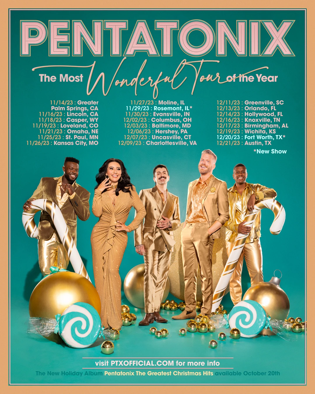 "Pentatonix: The Most Wonderful Tour of the Year" was the group’s 2023 holiday arena tour, supporting their compilation album, The Greatest Christmas Hits. The tour spanned from November 14, 2023 to December 21, 2023, launching in Palm Springs, CA and concluding in Austin, TX.